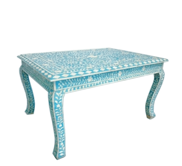 If you’re looking for a stunning decoration to make your living space stand out, then the Blue Bone Inlay Coffee Table is perfect for showcasing your modern decor taste. With its azure blue color and floral mosaic pattern, this table will instantly give your room life as well as that unique edge. This hand-crafted coffee table is made of solid wood so it can be customized to fit with any interior design style. It also features a brass decorative stud at either end of the tray top which will complement any Indian-themed home décor flawlessly.