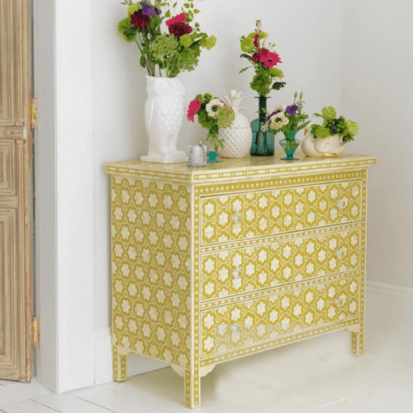 This is a high-quality product that is both intricate in design and made with customer satisfaction at the forefront that will add to the beauty of your living room or bedroom. It has three smooth drawers, intricately fitted with bone inlay for a richer look. The glass cut jewel-like knobs on this piece give it an elegant feel which will not go unnoticed by guests to your home. With its beautiful exterior, you can afford to flaunt this beautiful bone inlay chest of drawers amongst others as well! Designed and manufactured only after receiving the order from you, ensuring customers get a fresh product every time they buy from us!