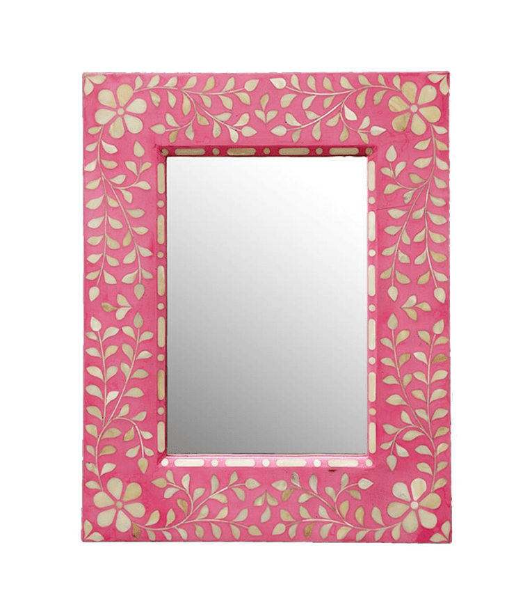 A perfect blend of arts and culture. The pink bone mirror frame will add a touch of authenticity and sophistication to any room. Beautifully enhanced with carved pieces of bone, this metal framed decorative wall mirror shows you the back or front in all its beauty. Be charmed by the intricately carved pieces of bone which give a more splendid look to your mirror. With its hardwood structure, durability is secured for years to come. Unique handicraft ideas are made possible with this Mirror Frame which presents you with endless designs and styles that will enhance every single living space in your home or office! Our frames can be customized in any size, color, shape, and design according to your tastes and preferences – something no store on earth can offer! Order now while supplies last!